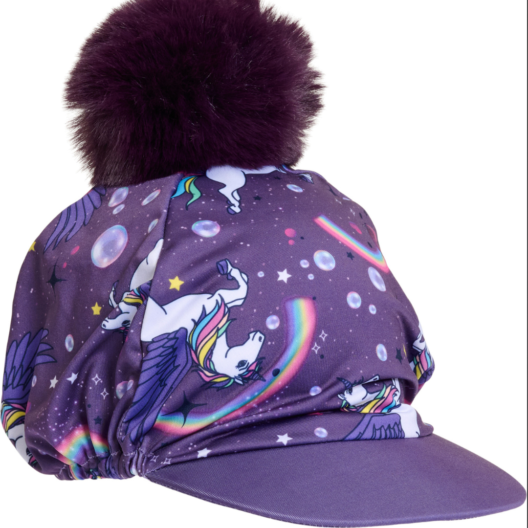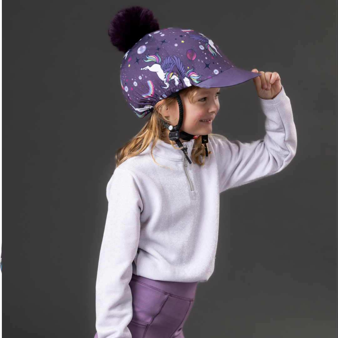 Kids Sunday hjelm overtræk fra Equipage i lilla med enhjørninge og flot mørkelilla fakefur kvast. Sjov som udklædning