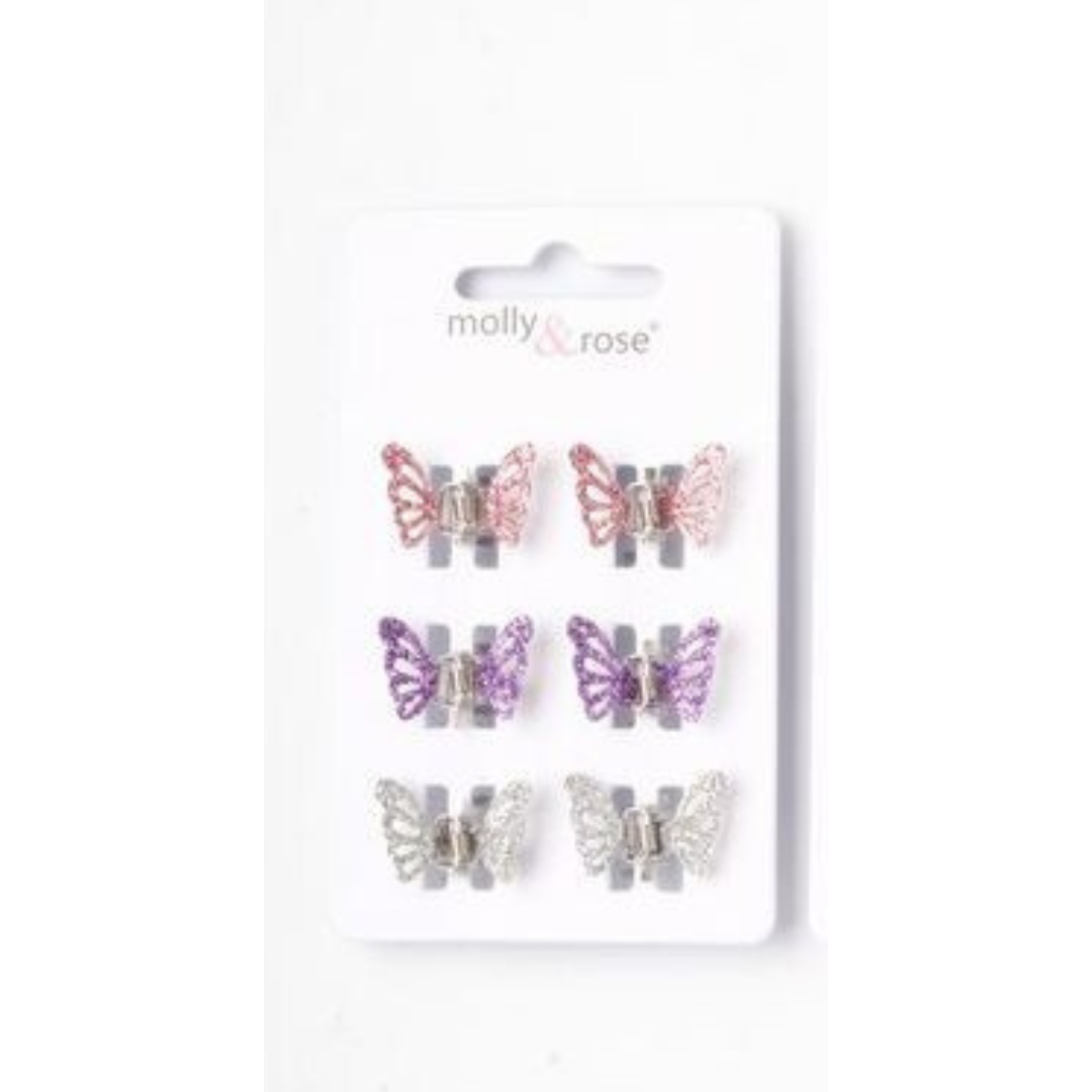 Små klemmer til håret med små søde glitter sommerfugle. Sæt med 6 stk i 3 forskellige farver.