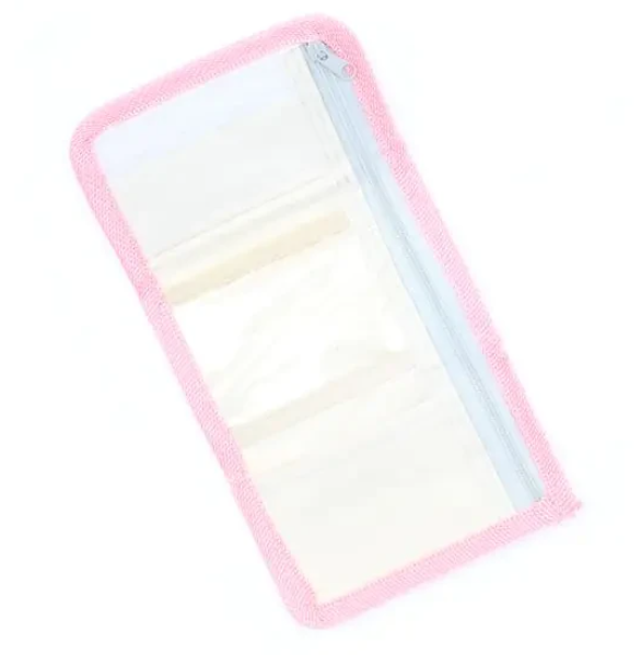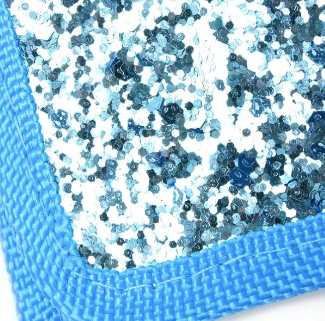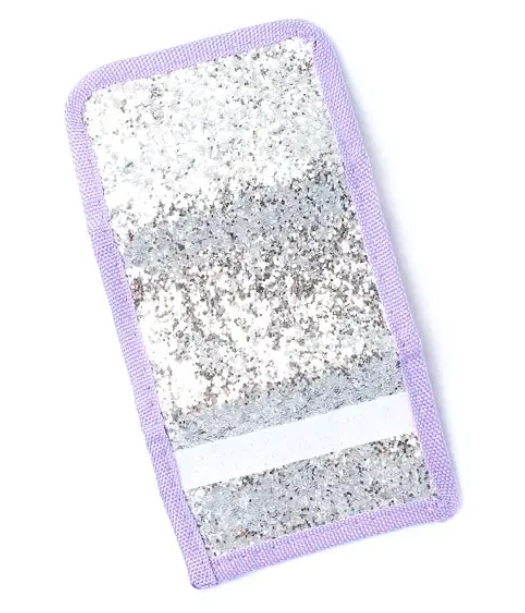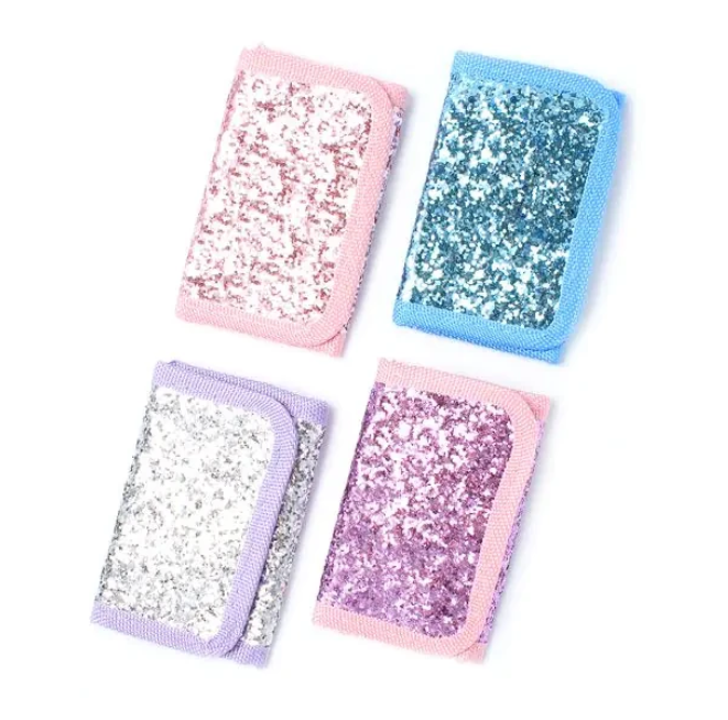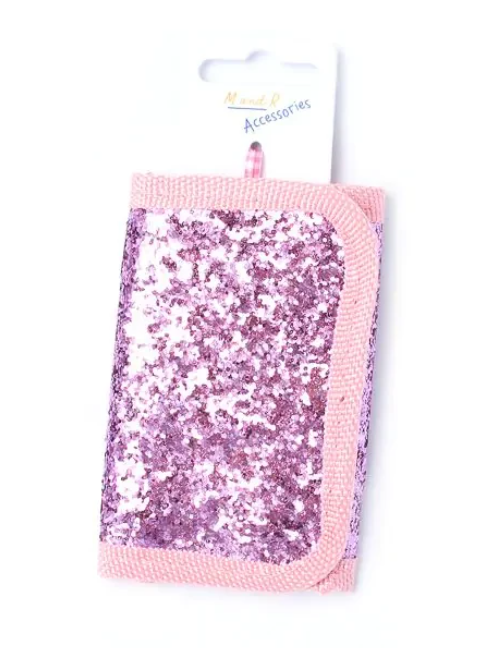 Lille foldud pung med glimmer, plads til sedler og mønter i lynlåslomme indvendig samt små rum til andet.
