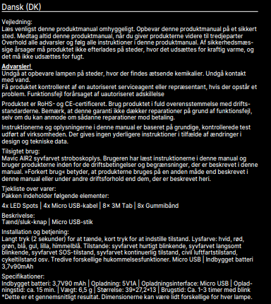 Genopladelig USB: 15 minutters opladningstid, 1-3 timers brugstid (varierer afhængigt af lystilstande).