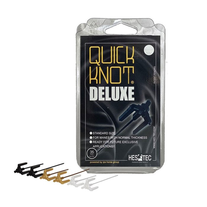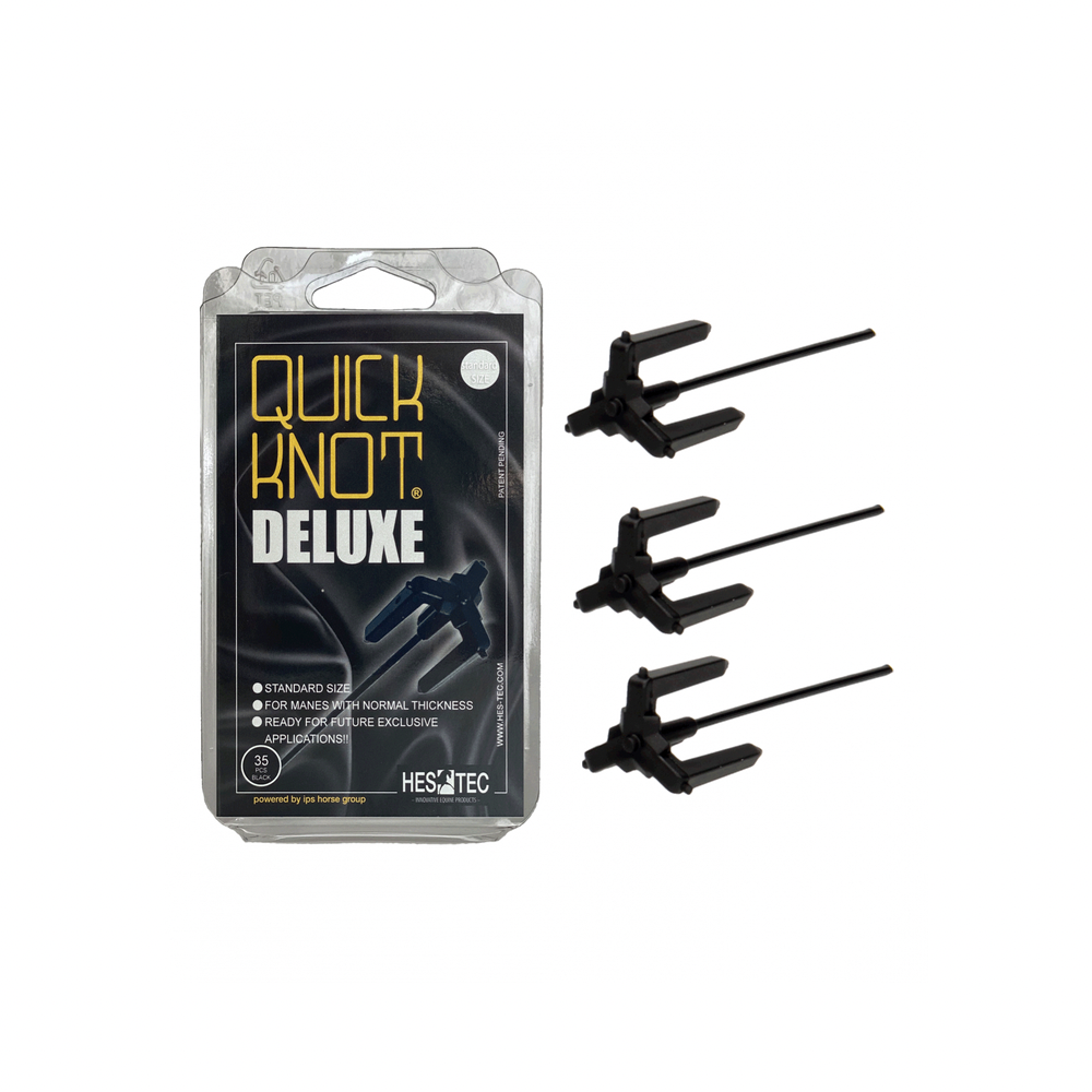 Lav de smukkeste holdbare rosenknopper på din hest med Quick Knot Deluxe. De er super nemme at bruge, fjernes nemt igen, og kan endda genbruges - flere gange. Du undlader helt at skulle have saksen frem når du fjerner rosenknopper, og mindsker derfor risikoen for at klippe hestens man.