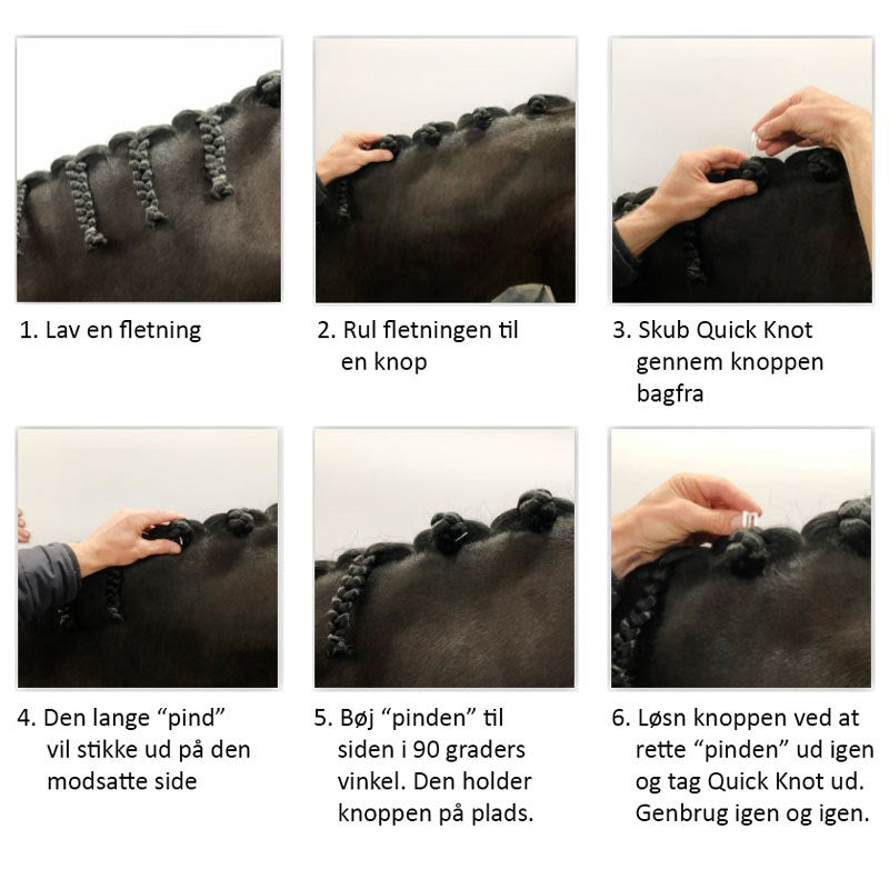 Dette er den alm. størrelse til heste med tynd-mellemtyk man, ca. 4 cm. lange. Fåes også i XL udgave til heste med kraftig man - Quick Knot Deluxe XL.