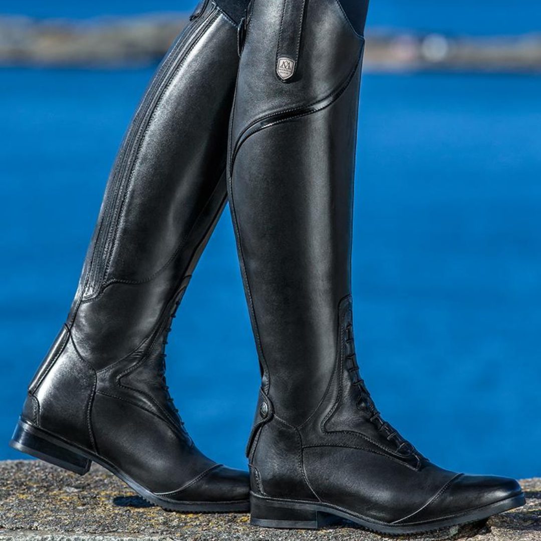 Mountain Horse Sovereign Young Regular/Wide læder ridestøver til den unge rytter, med eksklusiv Flexnotch™-teknologi som sikrer en blødere og lettere hælposition. Lavet i slidstærkt kernelæder. Slidstærk ægte YKK ®-lynlås bagpå. Skjult elastik langs indersiden bag på skaftet for mere individuel pasform. Integreret hærdet stålsvang for bedre stabilitet når man rider eller går.