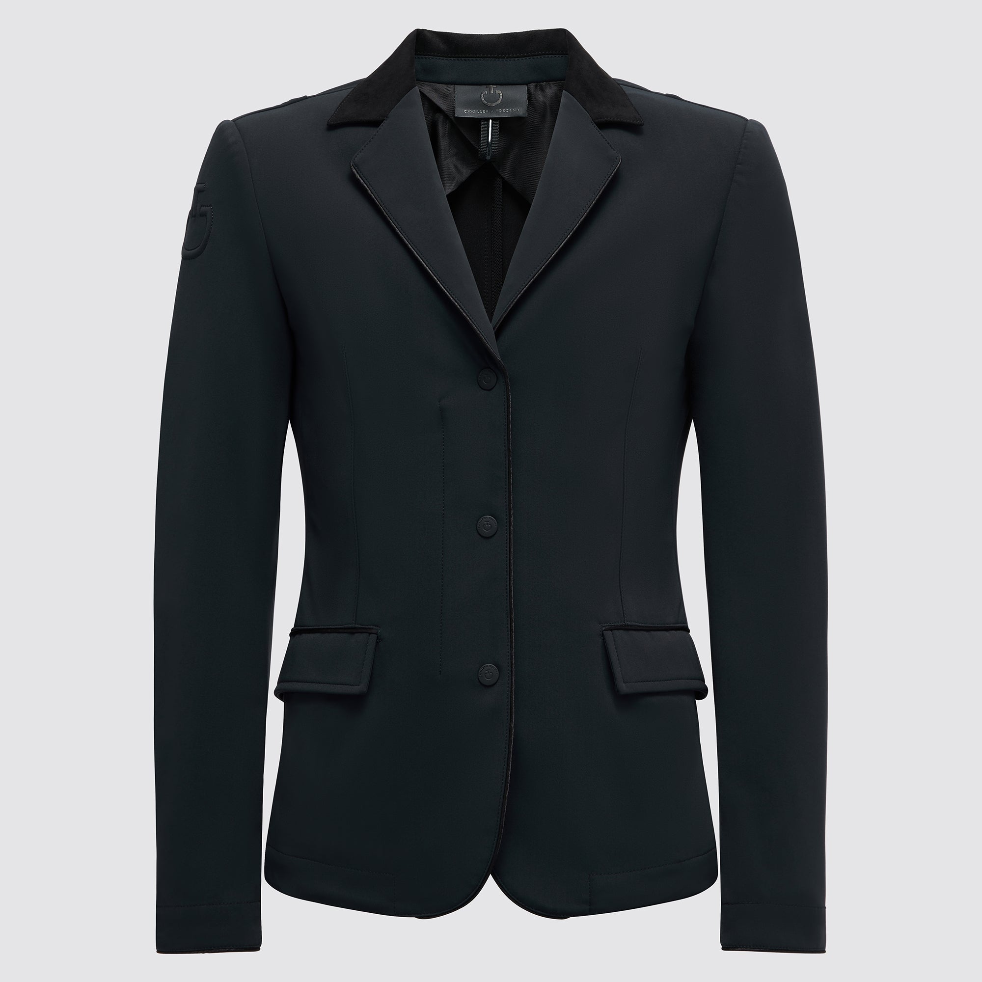 Klassisk ridejakke fra Cavalleria Toscana med lynlås og knapper til piger. Lavet af teknisk 4-vejs stretch jersey, som er både elegant og åndbart. Stoffet har antibakterielle egenskaber og er vandafvisende. Jakken har en alcantara-krave og kontrastfarvede piping i kanterne, to frontlommer og knapper.