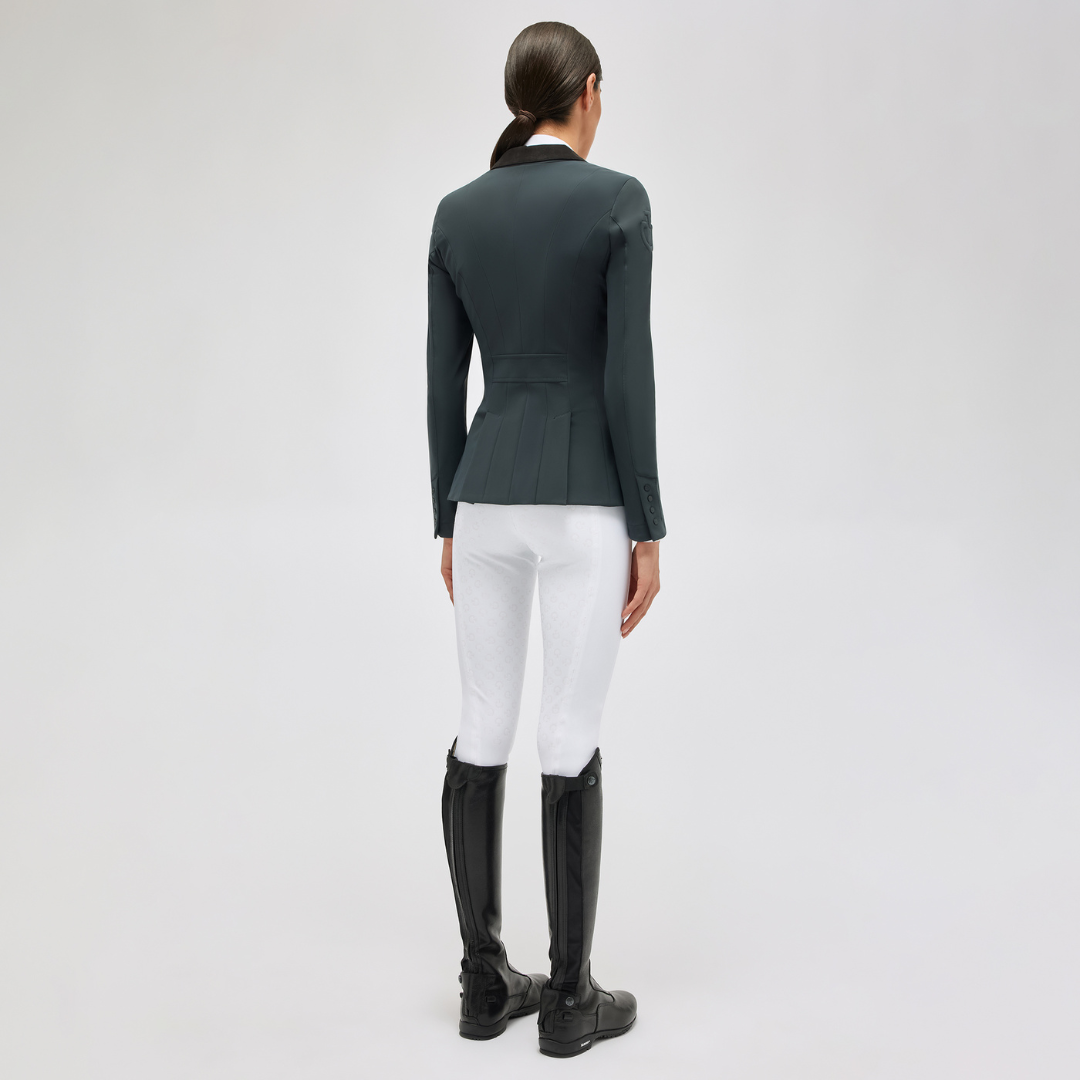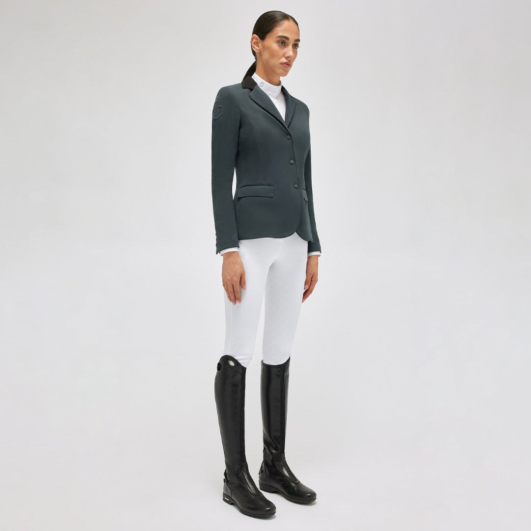 Klassisk stævnejakke fra Cavalleria Toascana til damer er lavet af teknisk 4-vejs stretch jersey, som er både elegant og åndbart. Stoffet har antibakterielle egenskaber og er vandafvisende, samt UV-beskyttende. Jakken har en alcantara-krave og kontrastfarvede piping i kanterne, to frontlommer og lynlås sjult bag knapper.