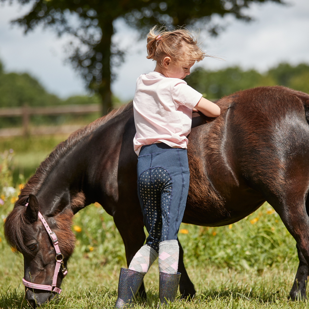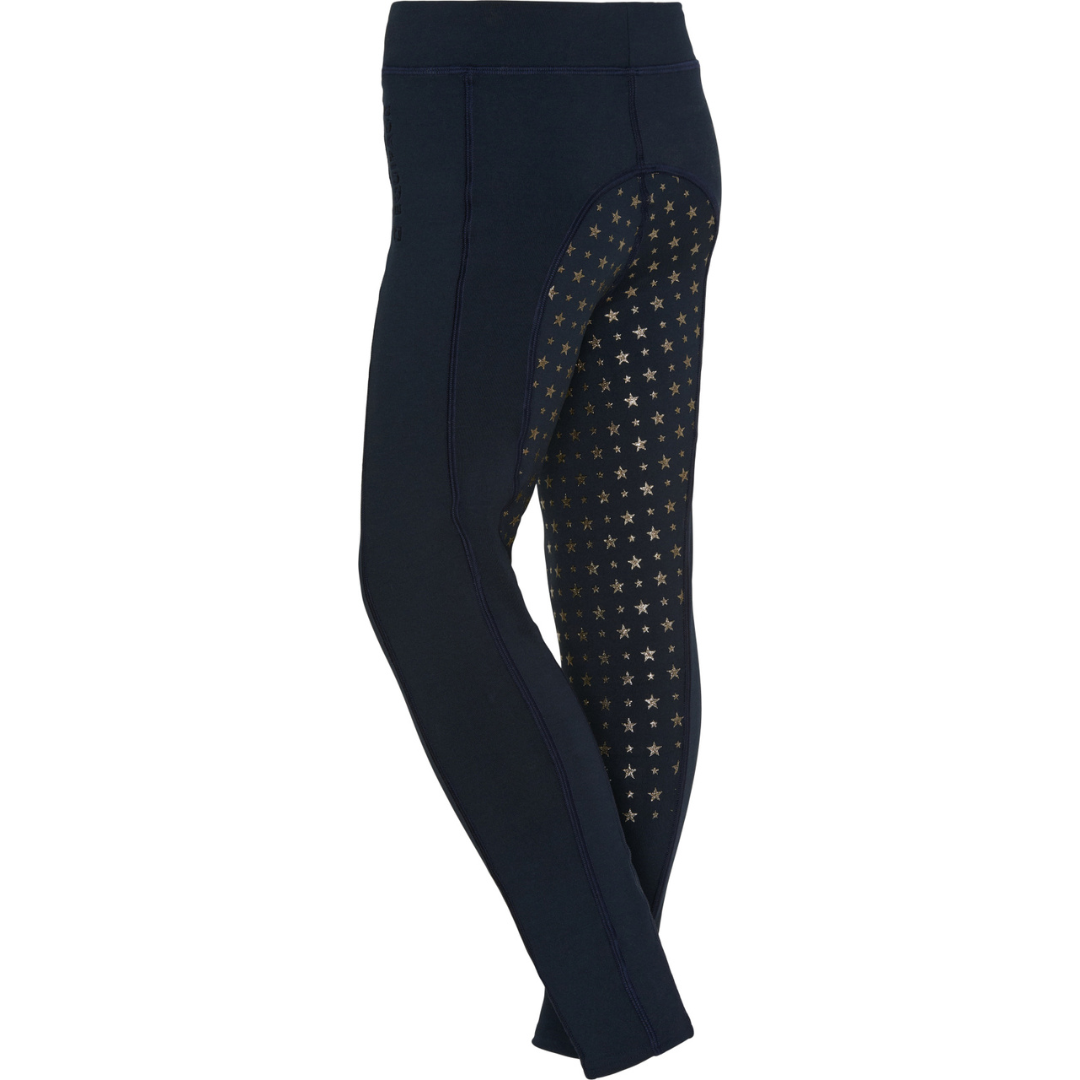 Ridetights med høj talje til børn. Komfortabel bred elastisk linning med indvendig elastik og knapjustering for perfekt pasform. Bukserne er med fullgrip med glimmer stjerne motiov. Lavet i blødt materiale og lette for børn selv at tage på. Med mobillomme på højre side